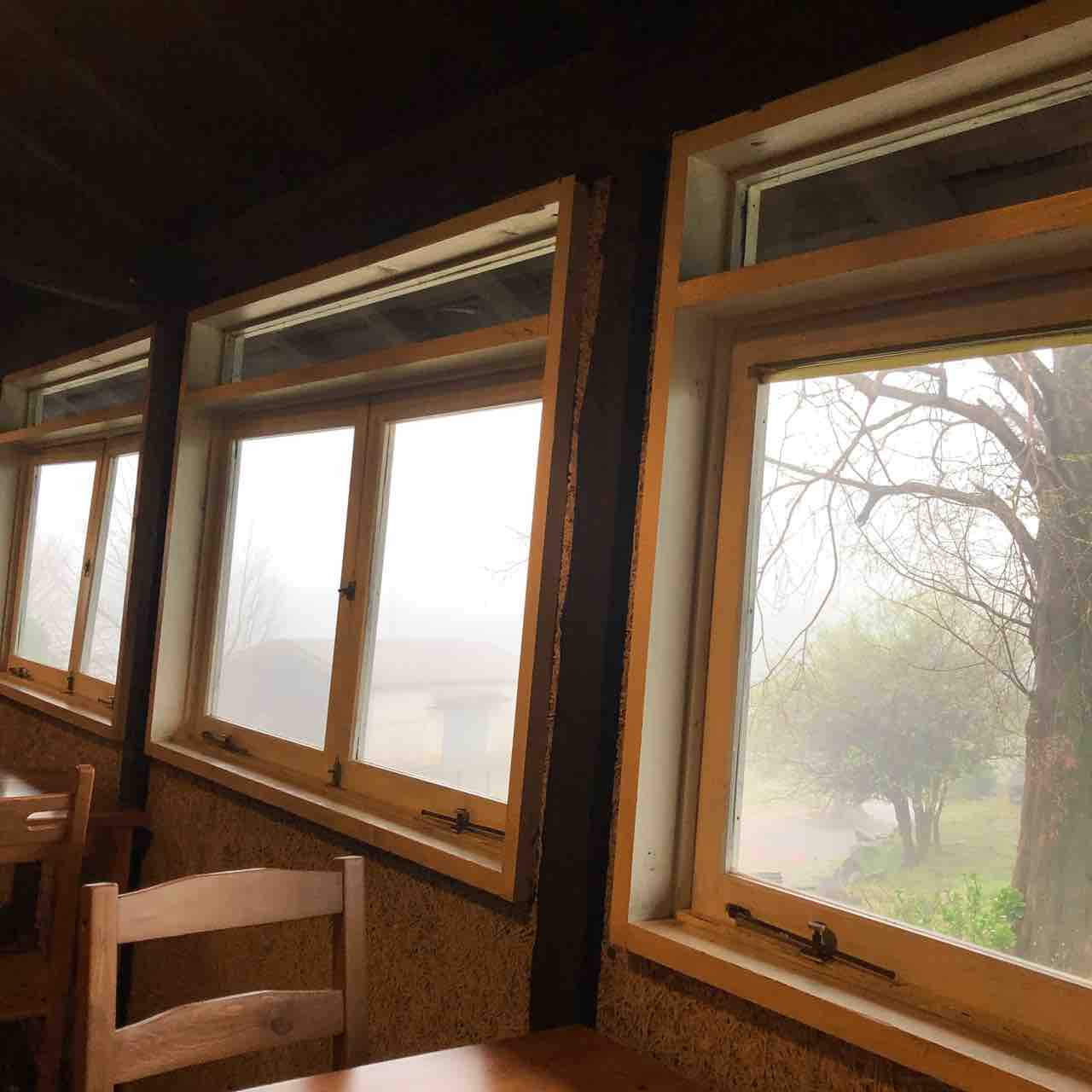 雨の日。雨脚も穏やかになり、霧が窓の外を白く照らしてます。